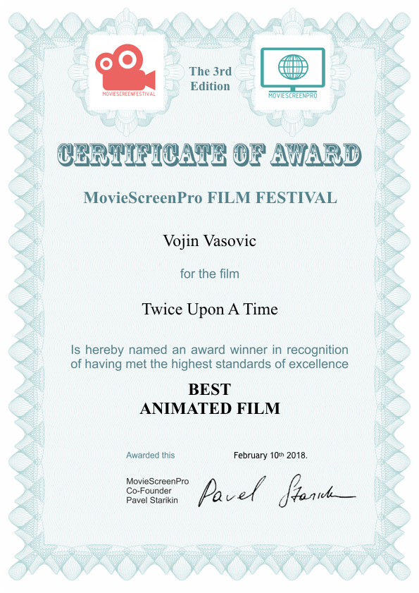 Kratkometražni animirani film “Bio dvaput jedan kralj” (Twice Upon a Time) Vojina Vasovića, diplomiranog reditelja i saradnika u nastavi na Akademiji umetnosti u Beogradu, osvojio je nagradu za najbolji animirani film na Movie Screen Festivalu u Los Anđelesu (6-10. februar), kao i nagradu za najbolji scenario i nagradu za najbolji animirani film na Barselona Planet Film Festivalu.