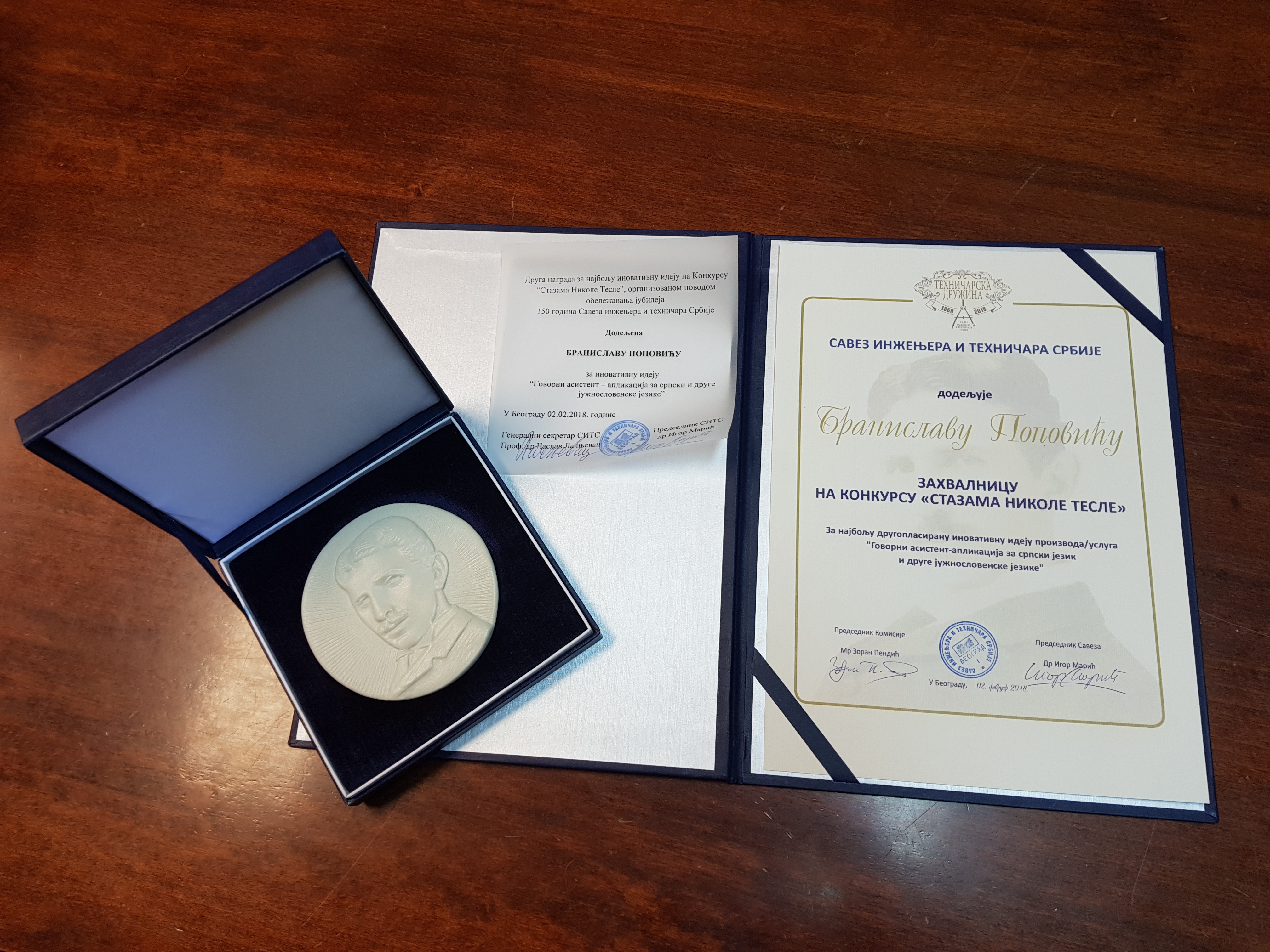Nagrada je dodeljena za inovativnu ideju za novi proizvod „Govorni asistent – aplikacija za srpski i druge južnoslovenske jezike“, povodom obeležavanja 150 godina postojanja Saveza inženjera i tehničara Srbije.
