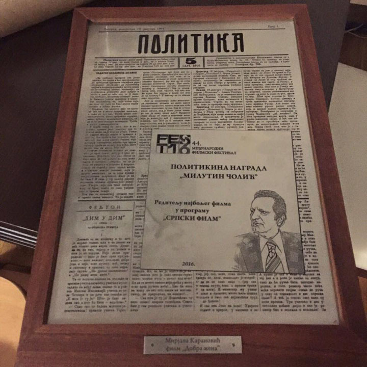 Novouspostavljenu nagradu Politike “Milutin Čolić”, dodeljivali su Dubravka Lakić, Dušan Milić i Miki Manojlović. Oni su takođe nagradili film “Dobra žena” u režiji prof. Mirjane Karanović. „Preuzimanje tuđe krivice na sebe jeste jedna od najvećih tema u stvaralaštvu. U životu taj čin često znači samožrtvovanje i pravi razliku između velikodušnih ljudi i onih drugih, malih, beznačajnih, zagledanih u svoje dvorište i nesposobnih da se suoče sa sopstvenim zlom. Takvom moralnom načelu bi trebalo svi da se povinujemo. Za film sa dušom, emotivno zrelog filmskog jezika i snažnog glumačkog ansambla, zbog hrabrog, dubokog prepoznavanja ljudskih odnosa, isključivosti i slabosti čoveka u nepovoljnim okolnosima što za posledicu ima naizgled miran život čiju višeslojnu stravu žive sve generacije .“