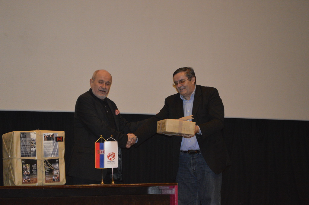 Dozvoli da ti na današnji dan, kada predaješ dužnost direktora Kuće na čijem si čelu bio 25 godina, koja je zahvaljujući tvojoj upornosti, neprekidnom zalaganju i veličanstvenoj ljubavi prema filmu, dobila i nov “krov nad glavom”, zahvalimo što si  sve to vreme bio prijatelj mladim umetnicima, i kao pedagog i kao njihov stariji kolega u profesionalnom radu.