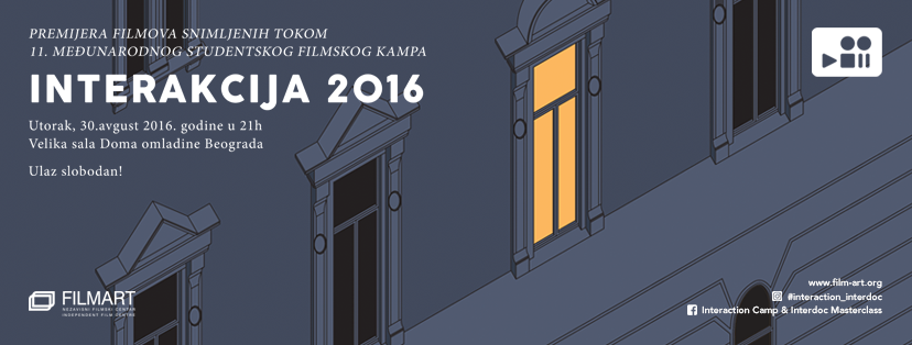 Premijerna projekcija dokumentarnih filmova snimljenih tokom 11. Međunarodnog studentskog filmskog kampa „Interakcija 2016“, biće održana u utorak 30. avgusta 2016. godine u 21h, u Velikoj Sali Doma omladine Beograda. Nakon premijere filmova, učesnicima kampa “Interakcija 2016” i ovogodišnjeg masterklasa “Interdoc 2016” biće uručeni sertifikati.