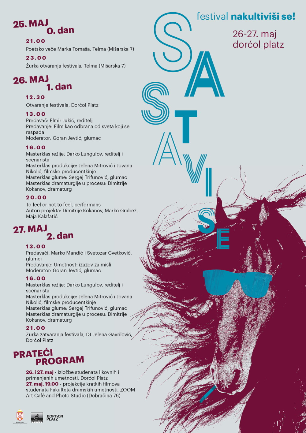 Udruženje KULTUROCILIN poziva studente da se priključe 25. 26. i 27. maja u Dorćol Platzu u Beogradu trećem regionalnom edukativnom festivalu “Nakultiviši se!”, namenjenom mladim autorima i studentima dramskih umetnosti.